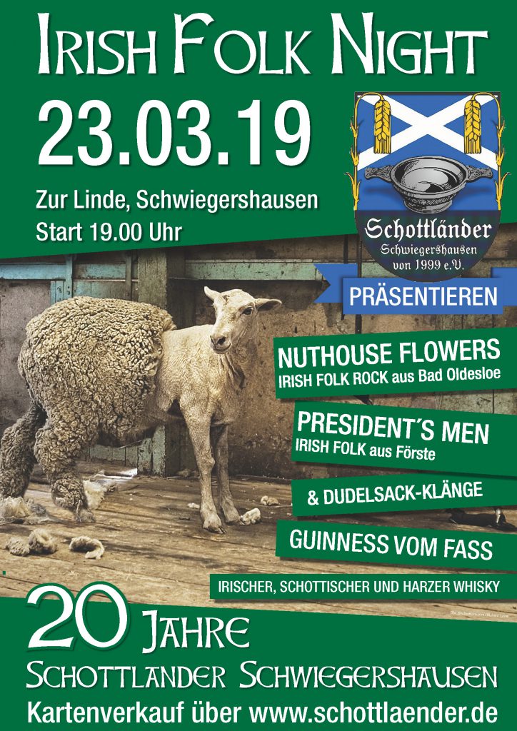 Das wollen wir gebührend mit euch feiern und veranstalten dazu eine Irish Folk Night mit den Nuthouse Flowers, den President`s Men sowie Dudelsackmusik.